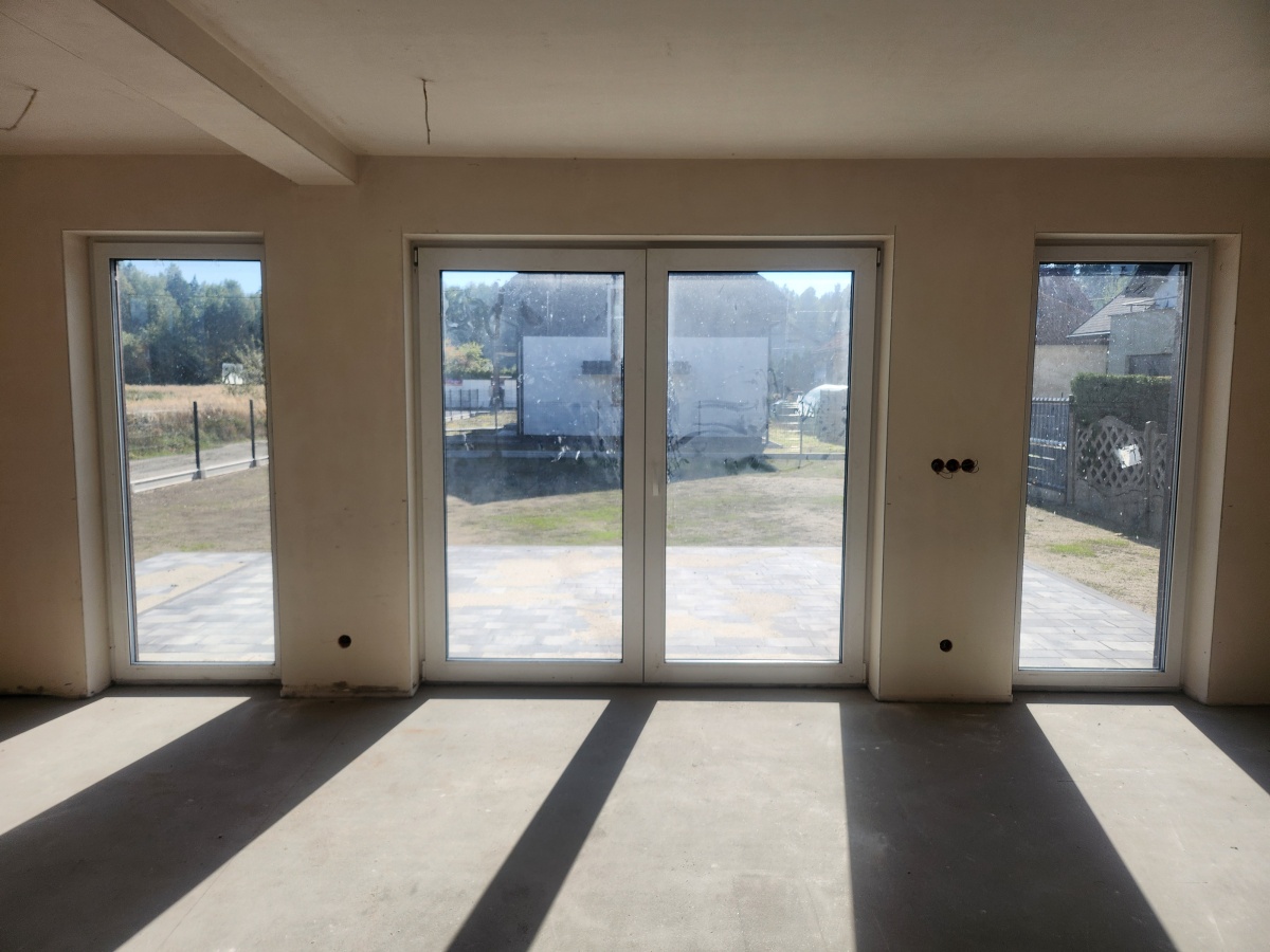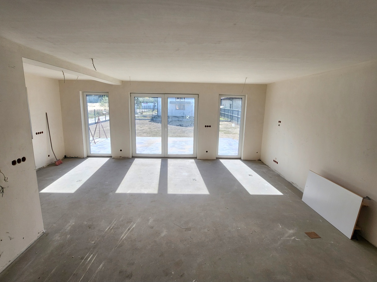 przestronny, słoneczny salon połączony z aneksem kuchennym, z wyjściem na taras i ogród od strony południowo-zachodniej,