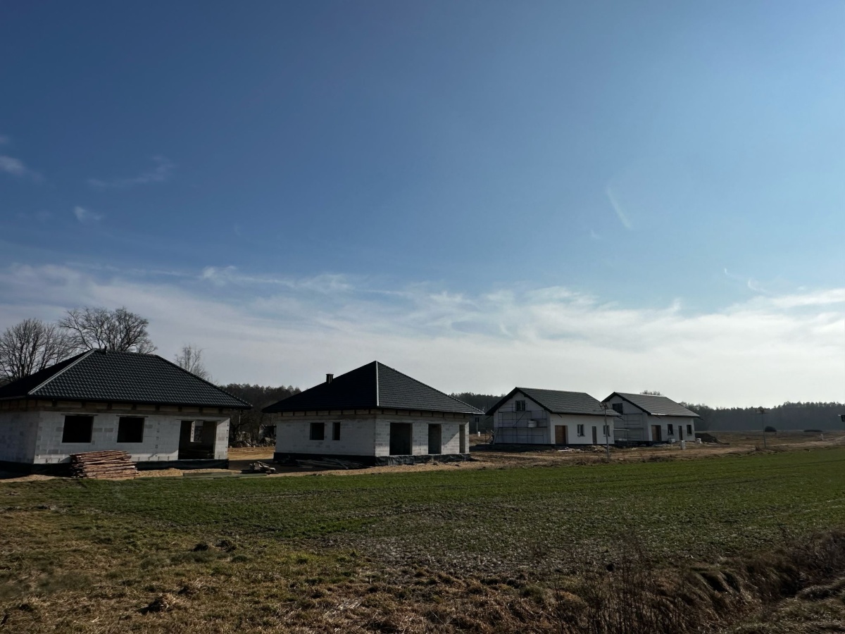 Cena budynku obejmuje wykonane ściany działowe, tynki gipsowe oraz instalacje tylko na parterze, otwory przygotowane do montażu ościeżnic i drzwi wewnętrznych.