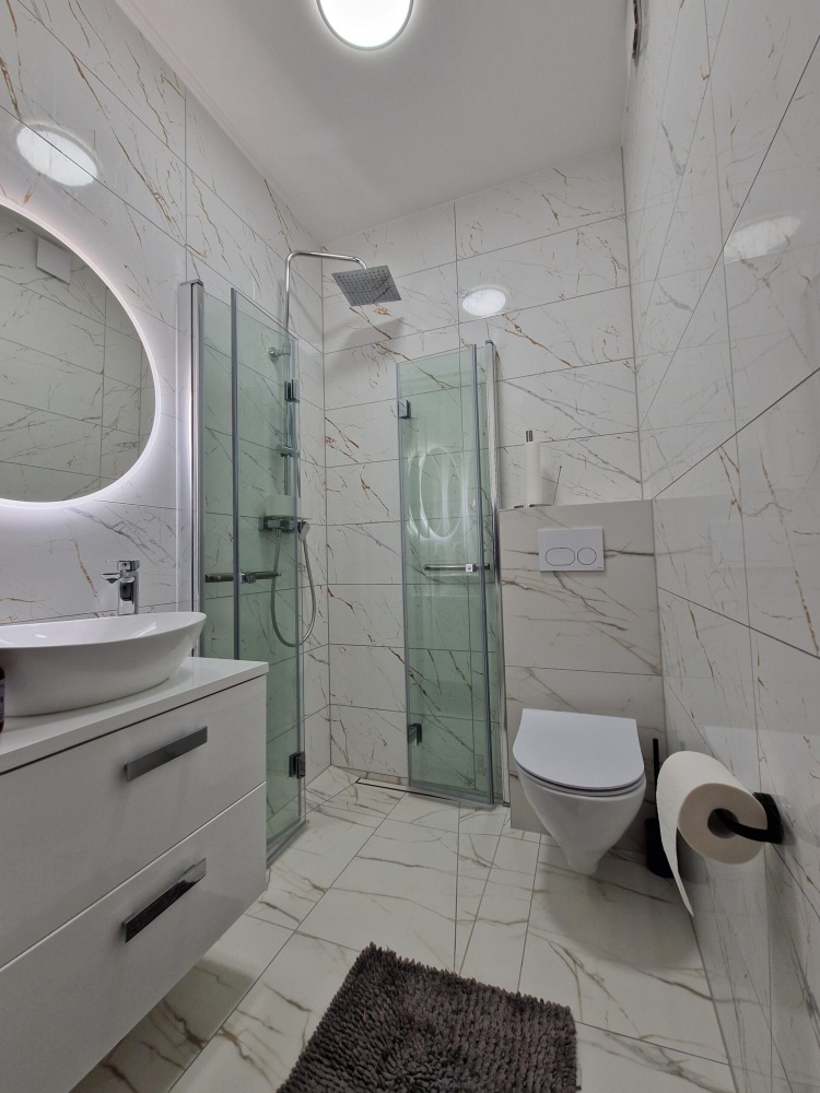 • Łazienka premium: styl marmur + kamień, podświetlenie LED , dwie umywalki, duże lustro, bidet, złota armatura, ukryte drzwi