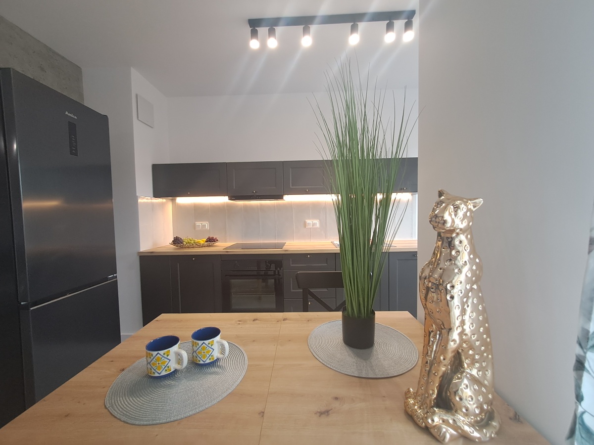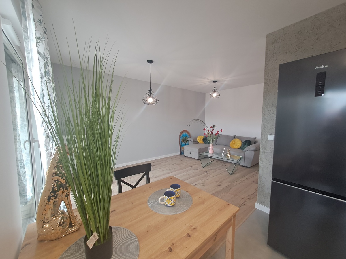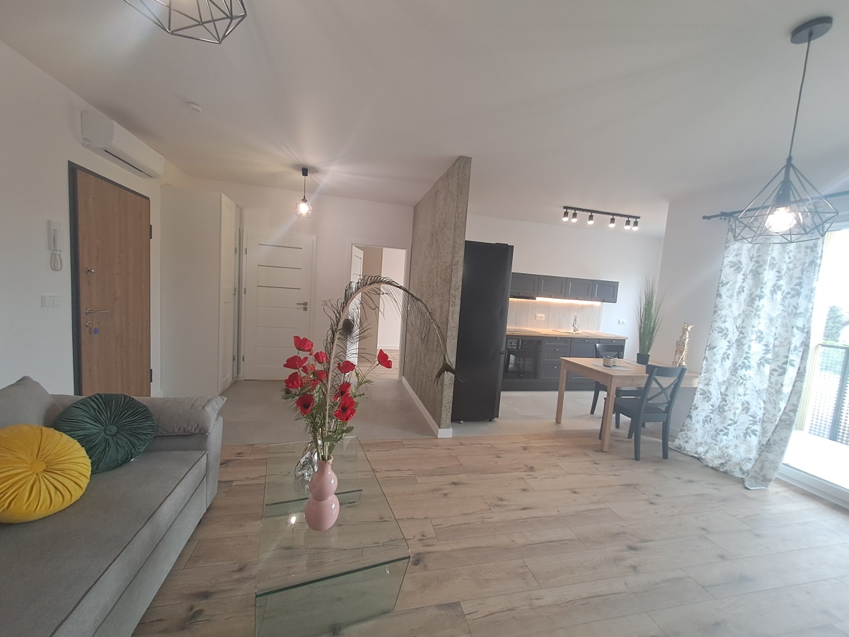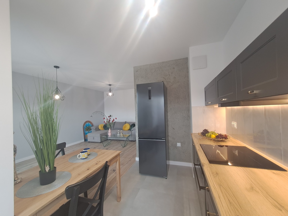 -jasny salon z kuchnią wyposażoną w AGD i z wyjściem na balkon