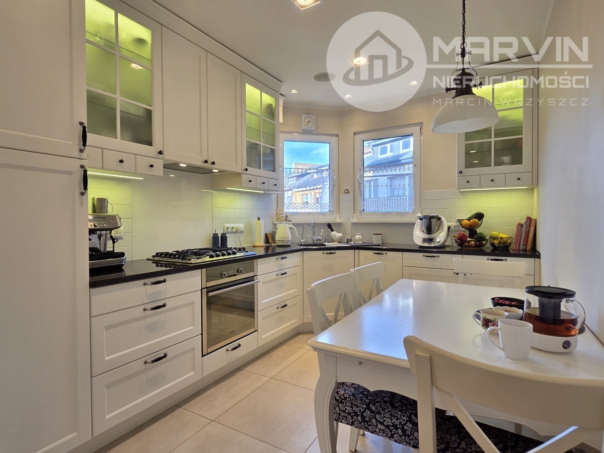 Wykończenie: kuchnia Premium z blatem granitowym, parkiet z naturalnego drewna, drzwi Porta (dźwiękoszczelne), okna PCV z moskitierami.