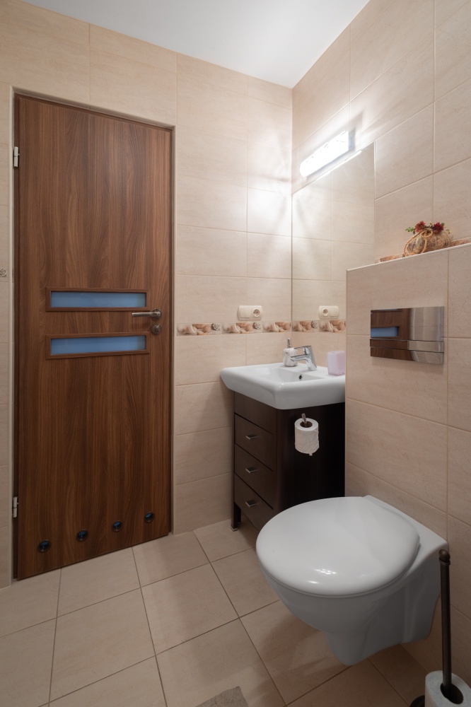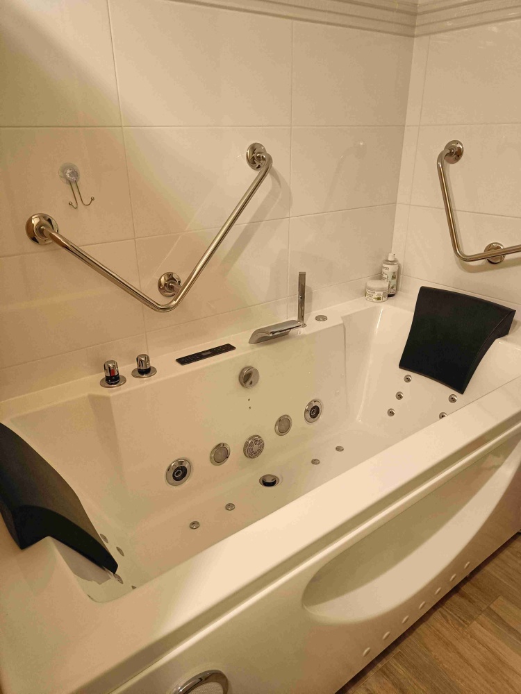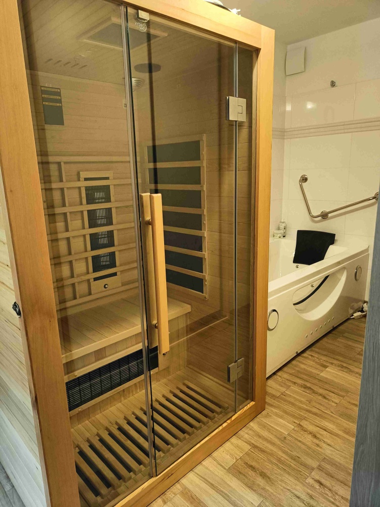 Ponadto na dolnej kondygnacji znajduje się duża kotłownia, pralnia, pomieszczenie gospodarcze, spiżarnia oraz wanna z hydromasażem dla dwóch osób i sucha sauna również dla 2 osób.