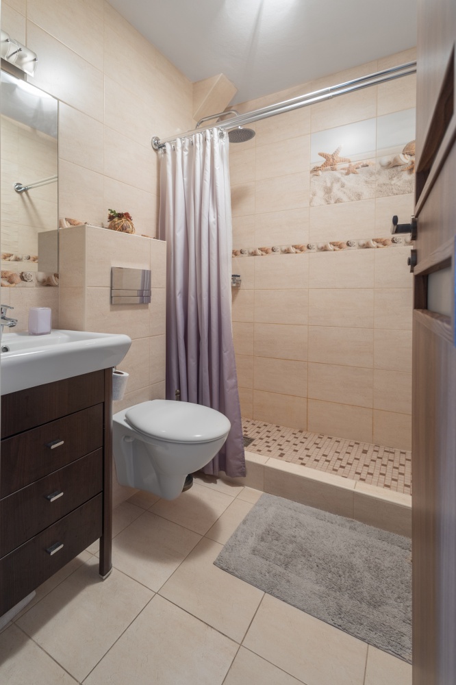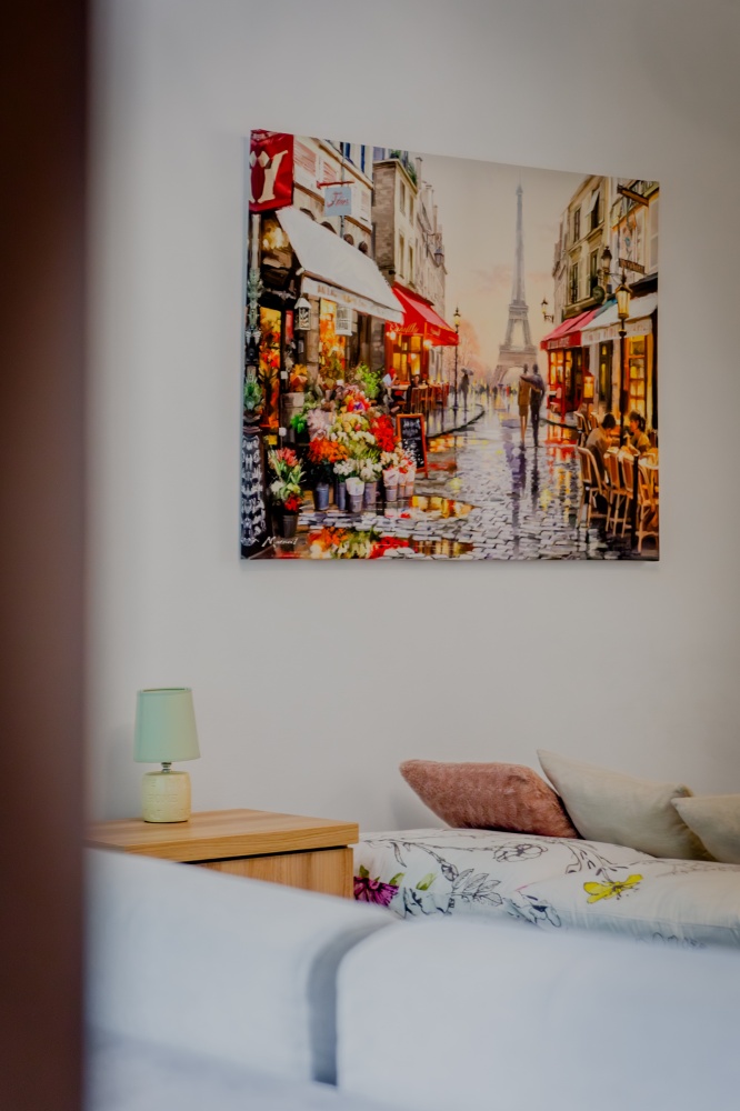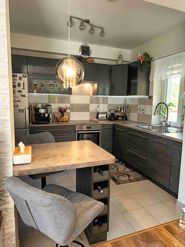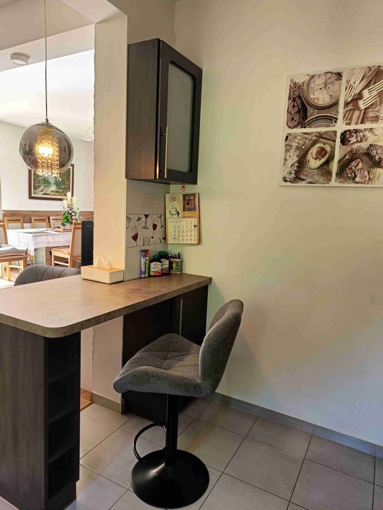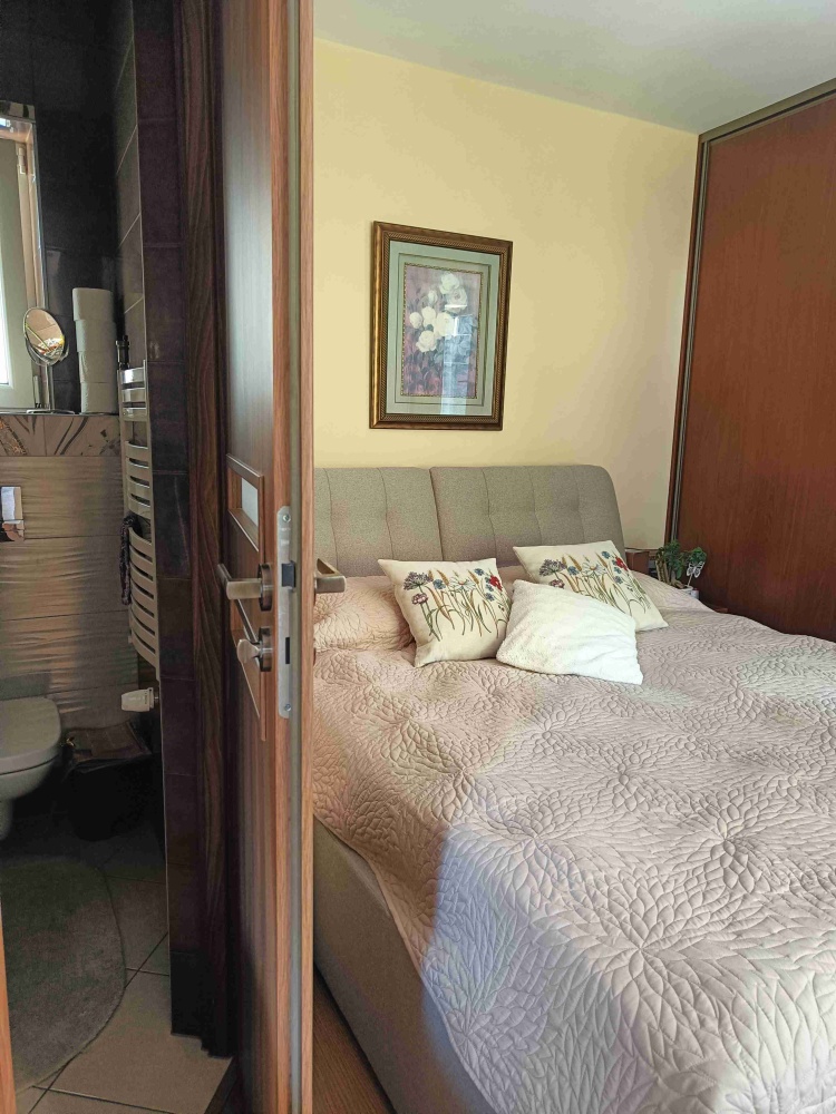 Na piętrze jest duży salon z dużą otwartą kuchnią i pełną łazienką, oraz sypialnia z połową łazienki.