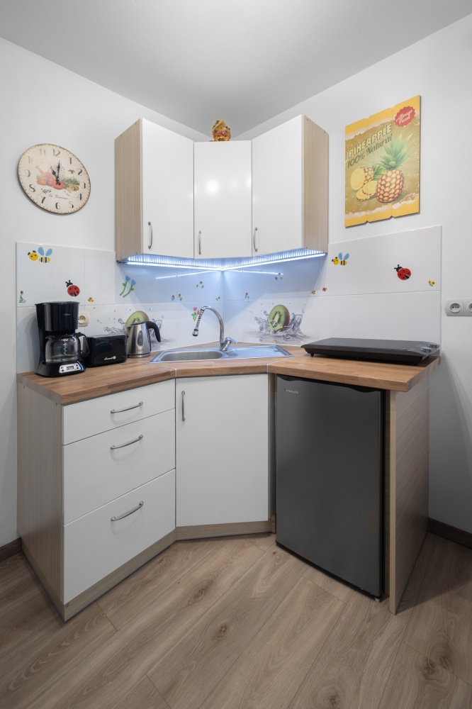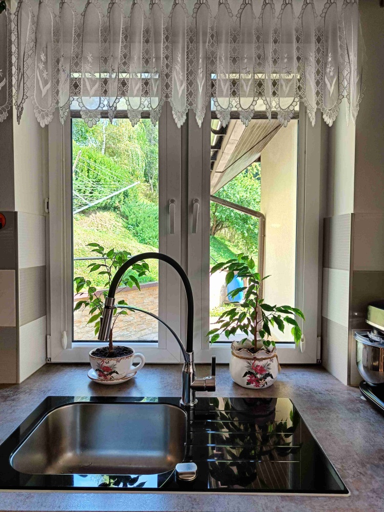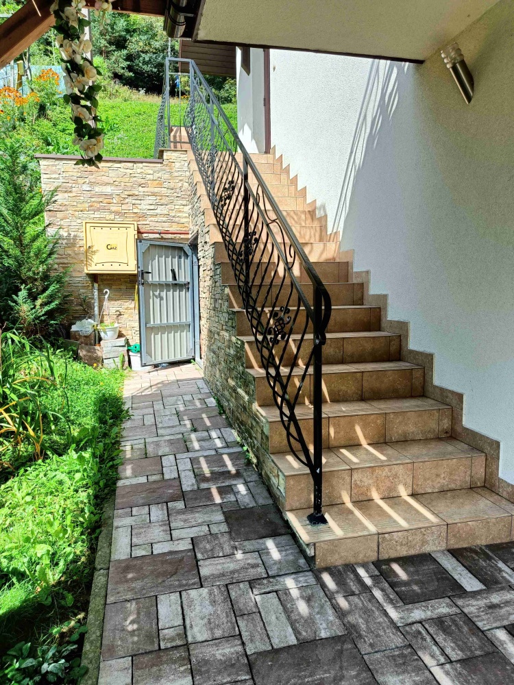 Na parterze znajduje się duży salon z aneksem kuchennym, sypialnia, oraz łazienka z prysznicem, oraz garaż przylegający do budynku otwierany pilotem.