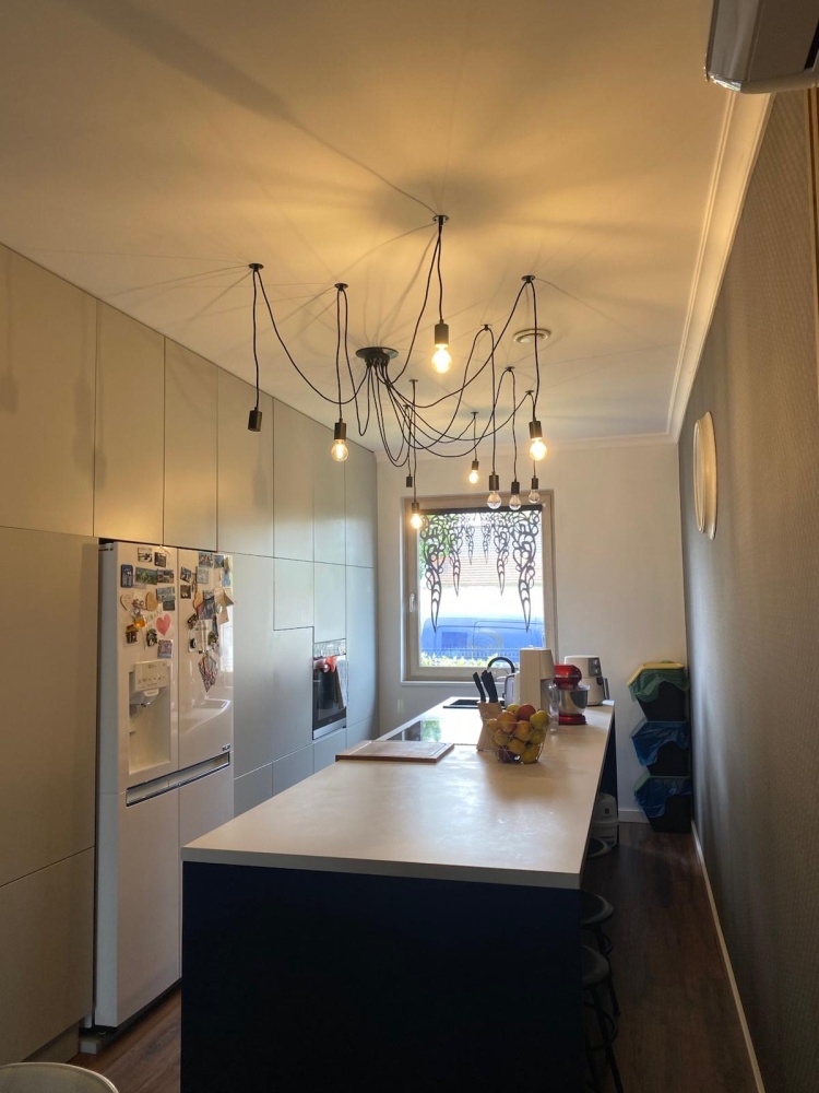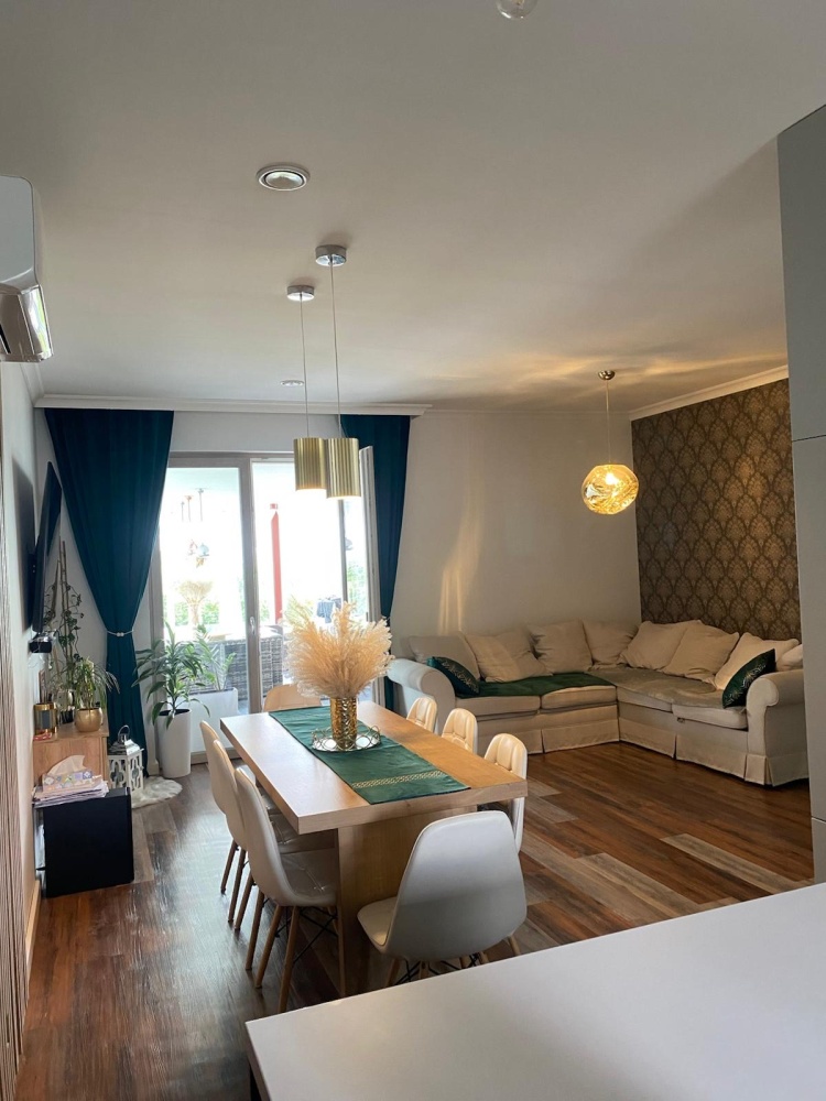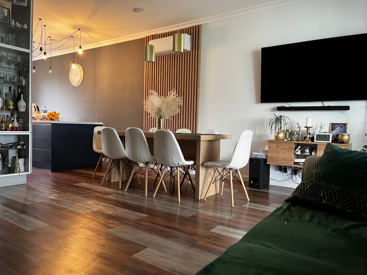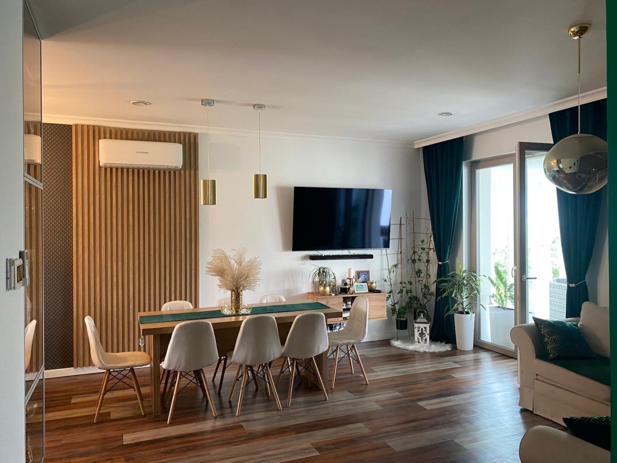 • Kuchnia z Jadalnią: Kuchnia, mimo że połączona z salonem, jest funkcjonalna. Posiada nowoczesną zabudowę, dużo blatu roboczego i miejsca na sprzęty AGD. Wyspa kuchenna to idealne miejsce do szybkiego śniadania i interakcji z gośćmi. Tuż obok znajduje się jadalnia, z dużym stołem, który z łatwością pomieści całą rodzinę. Otwarte połączenie sprzyja wspólnemu spędzaniu czasu i integracji.