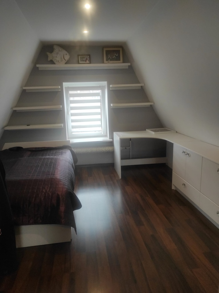 Na poddaszu znajdują się dwie sypialnie oraz pojemna szafa w zabudowie.