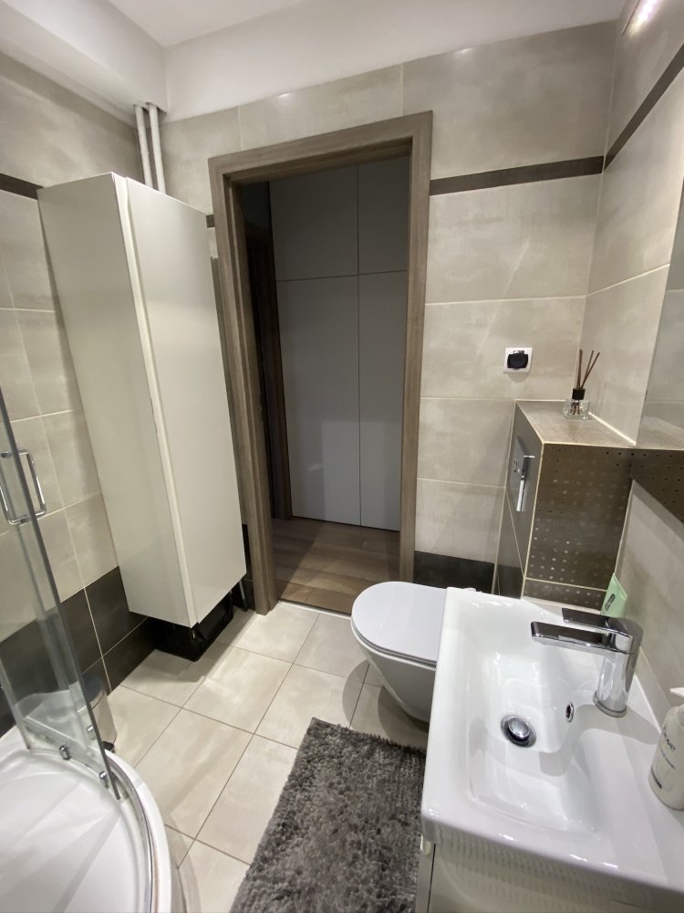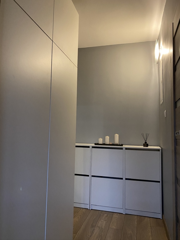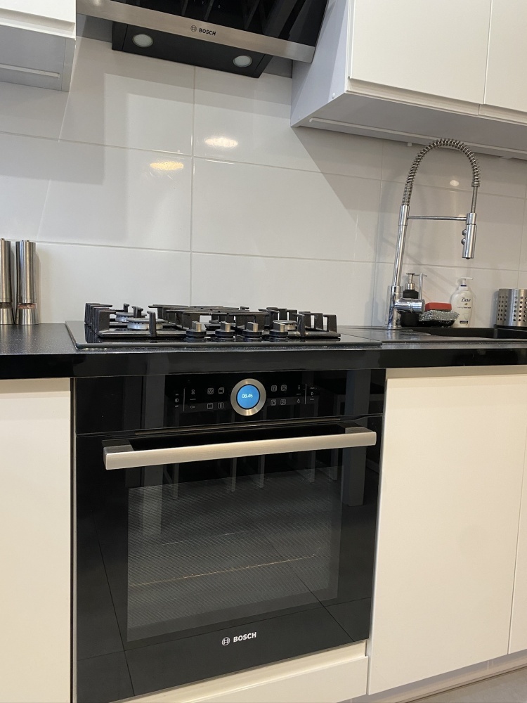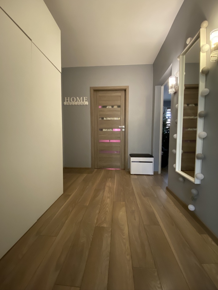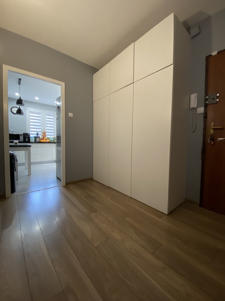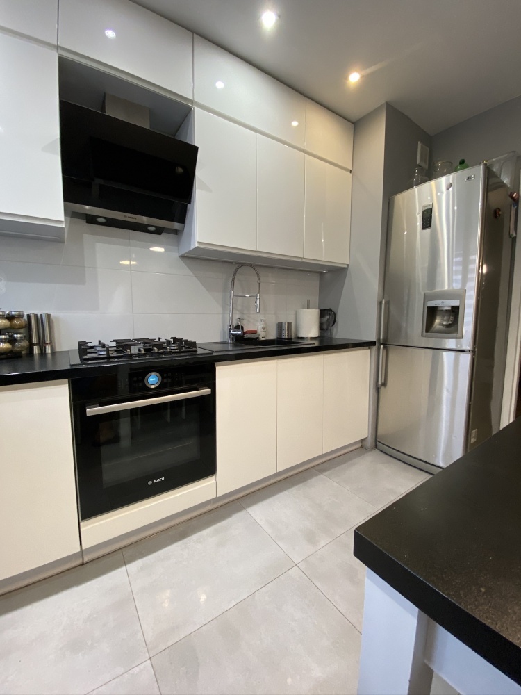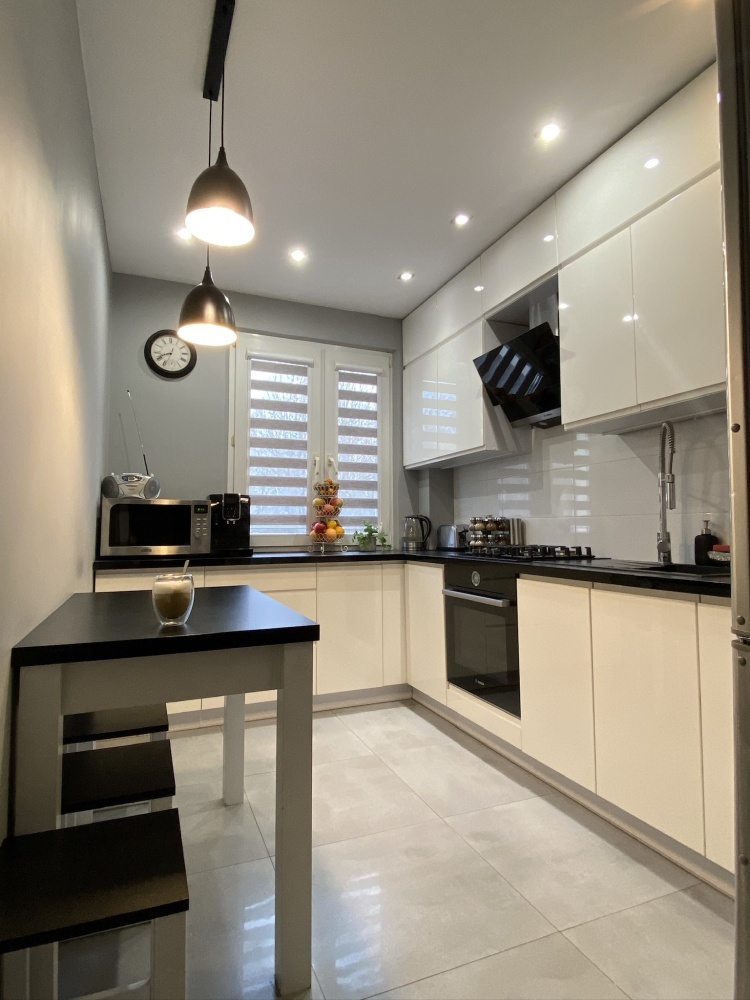 Mieszkanie dwustronne o wysokim standardzie w kuchni dużo pojemnych szafek, wysokiej klasy sprzęt AGD firmy Bosch.