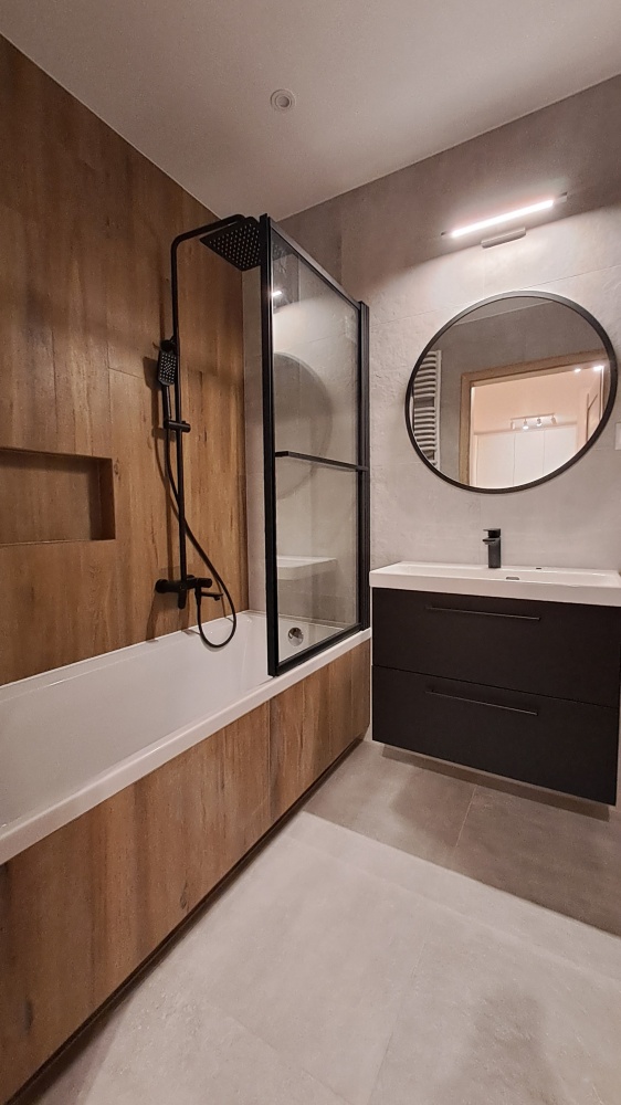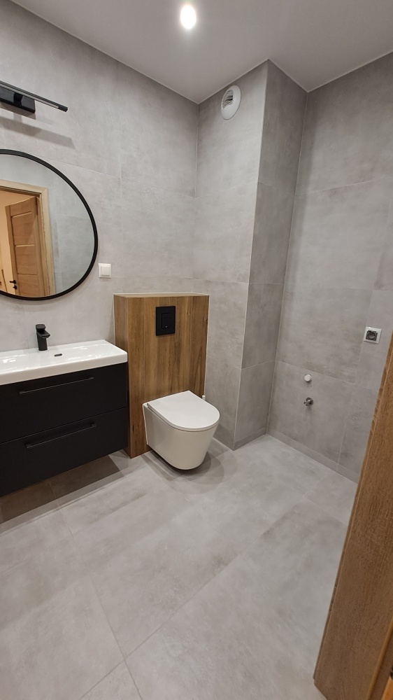 Podwieszany sufit w łazience. Podłoga z paneli winylowych.