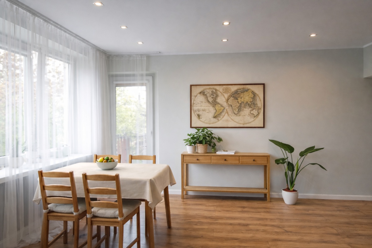 Lokal wyróżnia się atutem, którego nie da się „doremontować” — jest bardzo cichy, trójstronny i dobrze doświetlony. Okna wychodzą na trzy strony świata, a za nimi znajduje się dużo zieleni, co przekłada się na komfort codziennego życia, przewiewność i przyjemne doświetlenie wnętrz.