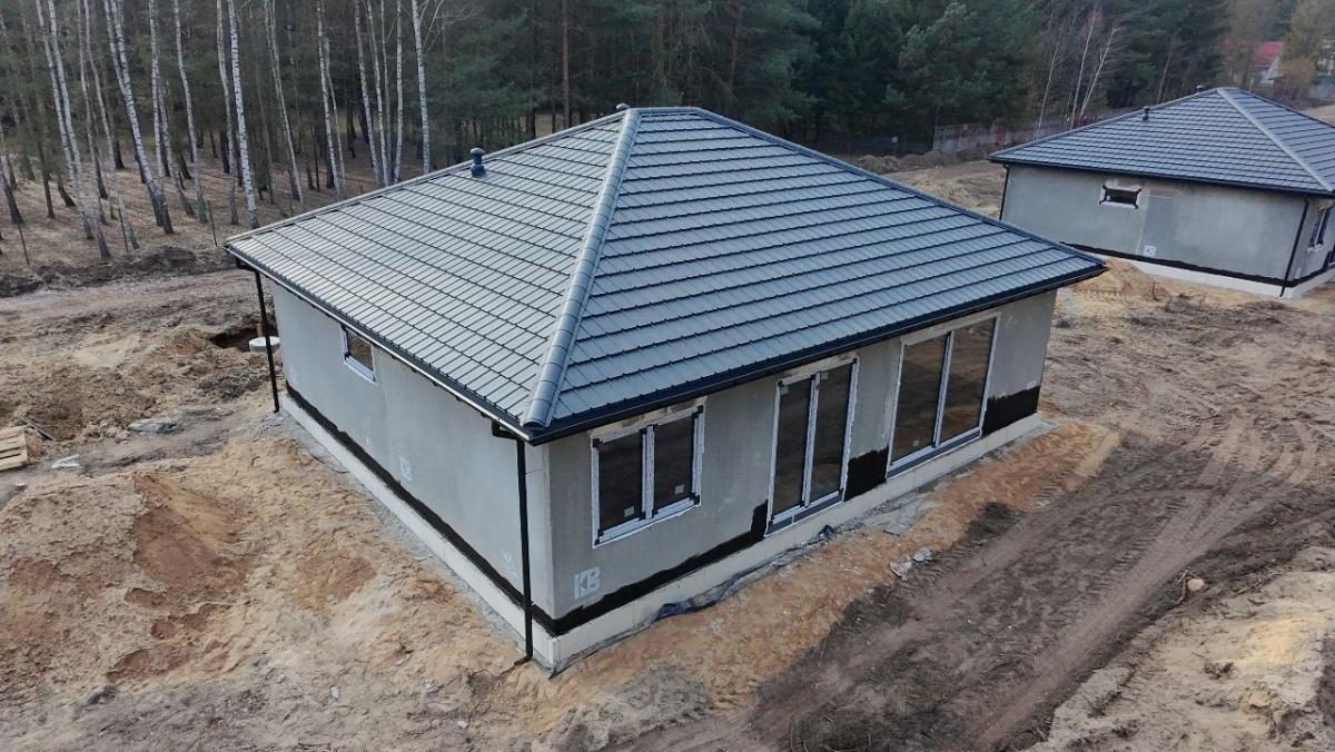 Budynek wykonany świetnym standardzie energetycznym w technologii betonowo‑keramzytowej na płycie fundamentowej
