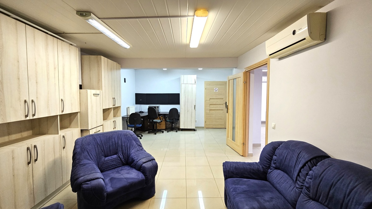 Piętro – 130m2 ( biura, magazyn) 3-ech pokoi: 2szt x31m2+22m2+12m2, 2szt x 5.5m2 WC+ prysznic, pomieszczenia socjalnego, przedpokoju z korytarzem i klatką schodową.